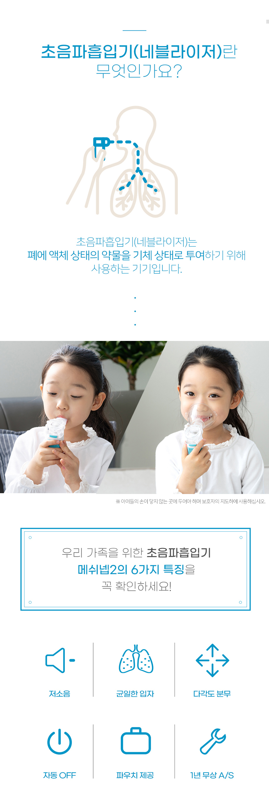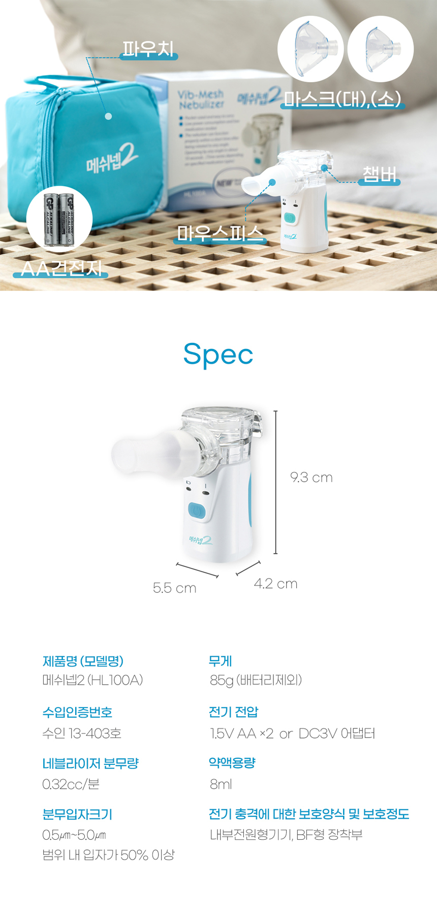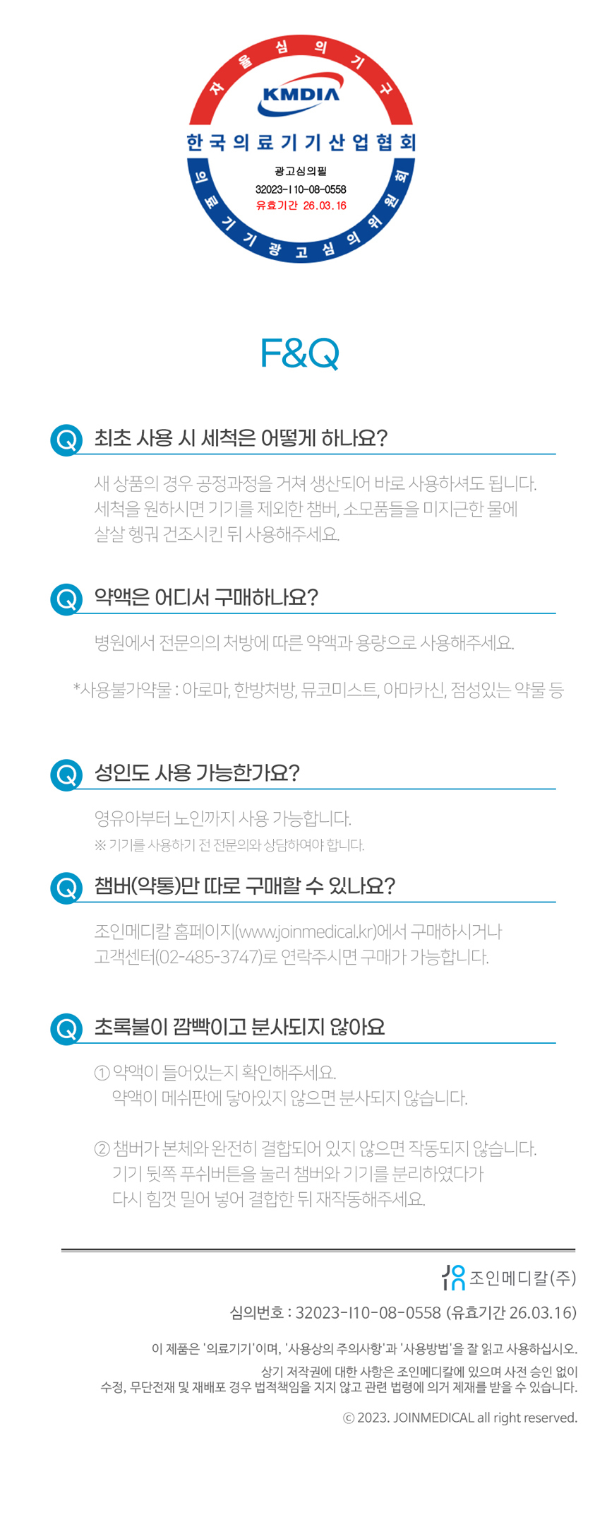 | 구매전 주의사항 | 한방약물/아로마 사용금지. 점성이 높은 약물 사용불가. 벤토린,풀미칸 등 양약 약제만 사용 가능. (아로마, 한방처방, 뮤코미스트, 아마카신 황산염 등 사용금지) | ||